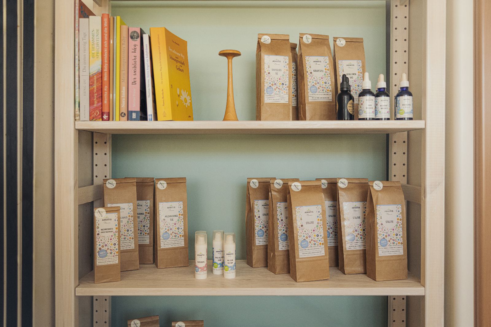 Die Praxis ist ein Ort wo du ausgewählte Produkte kaufen kannst, wie z.B. Tees, Öle und Salben für die Schwanger-schaft, das Wochenbett und die Pflege deines Babys.